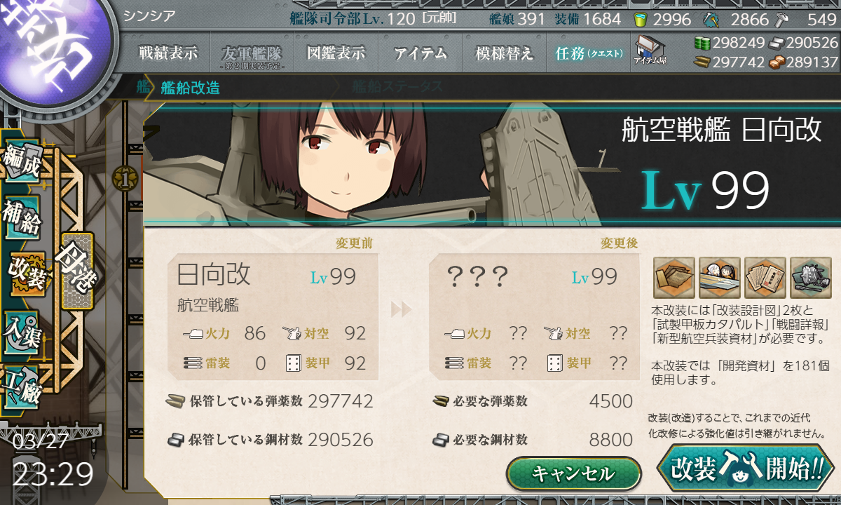 2019年03月29日 【艦これ】日向改二! さぁ、さっそく改二にしませぅ 改装設計図2枚とカタパルト、戦闘詳報に新型航空兵装資材 いっぱいいりますね… おまけに開発資材を181必要とか大変です 無事改二に。 任務周りや改修で瑞雲がむちゃくちゃいるので その辺はゆっくりやっていくしかないかもですね