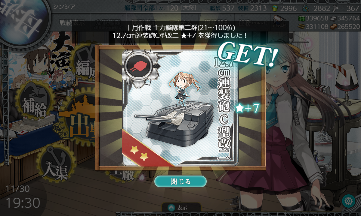 2022年11月30日 【艦これ】令和四年【十月作戦】強風改二 ★+1、12.7cm連装砲C型改二 ★+7 そして 熟練甲板要員 げっと! ランカー報酬もらえました!主力艦隊第二群(21~100位)●[改修水上戦闘機] 強風改二 ★+1 new!●[改修小口径主砲] 12.7cm連装砲C型改二 ★+7●[航空母艦要員] 熟練甲板要員強風改二!!