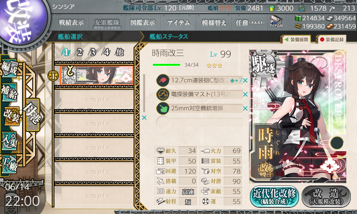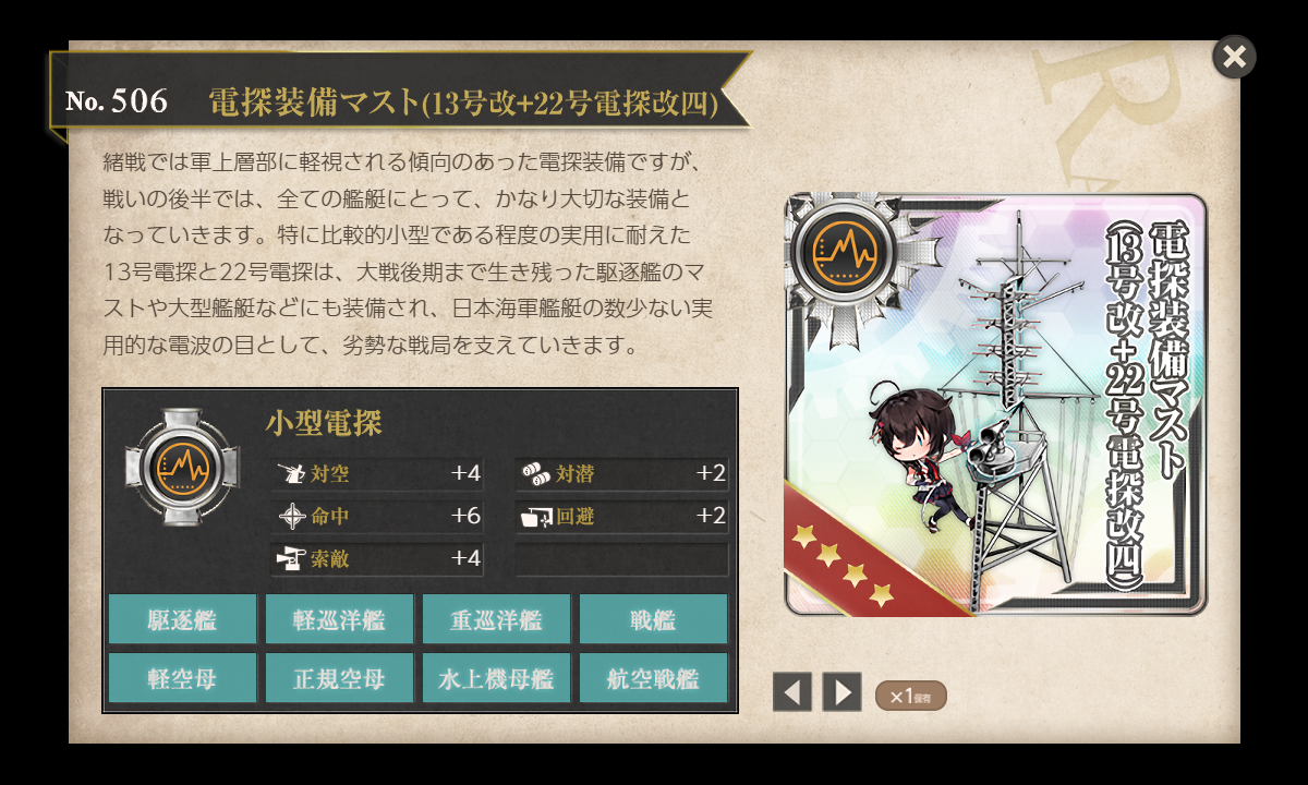 2023年06月30日 【艦これ】令和五年度月次作戦【五月作戦】14inch/45 三連装砲 ★+2、14inch/45 連装砲 ★+3 そして 22号対水上電探改四(後期調整型) ★+3 げっと! ランカー報酬もらえました!主力艦隊第二群(21~100位)●[海外大口径主砲] 14inch/45 三連装砲 ★+2 new!●[海外大口径主砲] 14inch/45 連装砲 ★+3 new!●[改良水上電探] 22号対水上電探改四(後期調整型) ★+3こ、これは…新装備だけど…、夏イベの新艦の装備??っぽいけど…ハズレっぽいような…でも電探は命中+9だしあたりですね