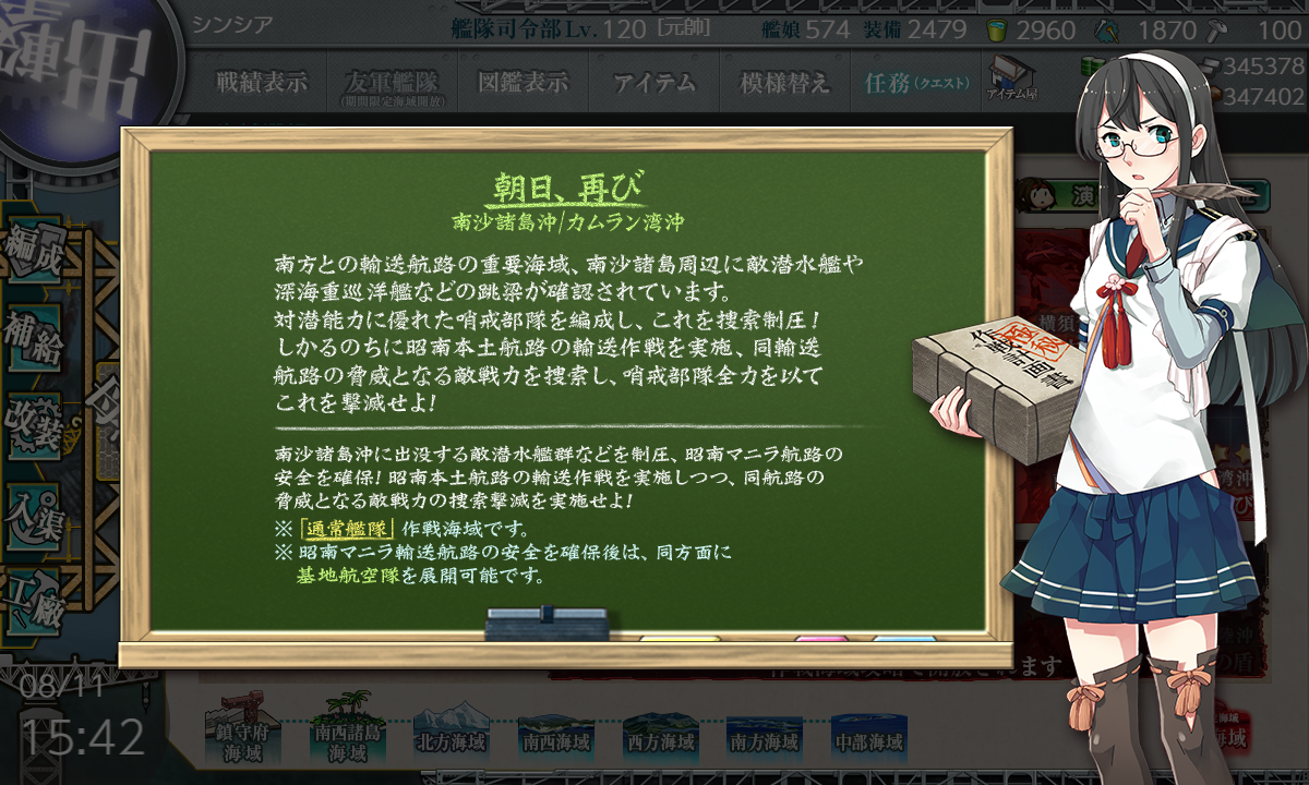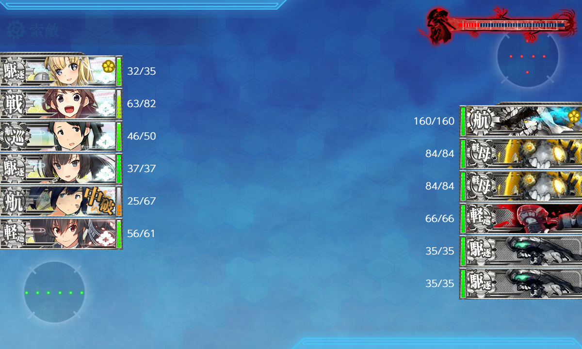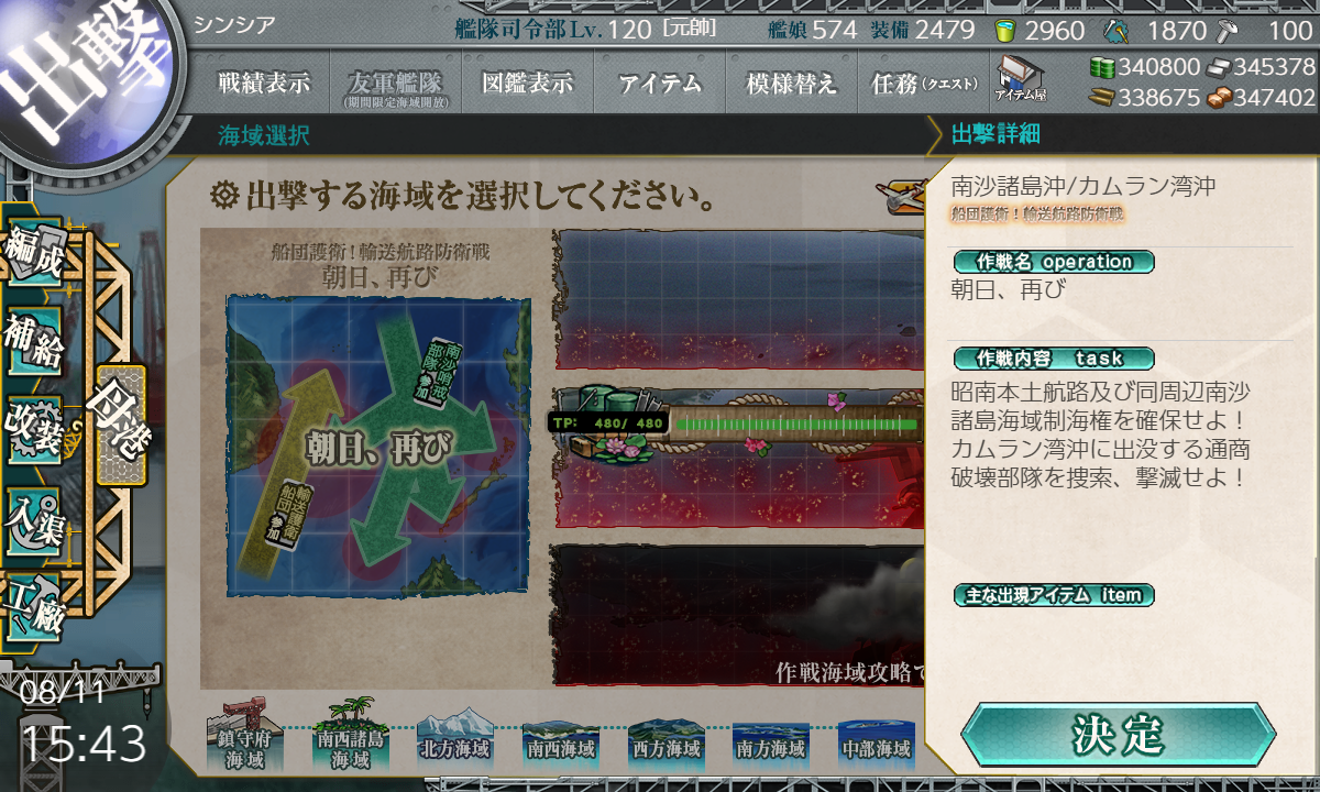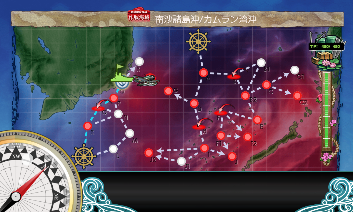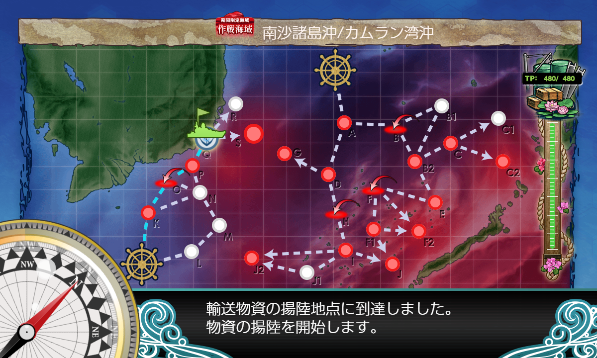 2023年08月11日 【艦これ】 E-2 南沙諸島沖/カムラン湾沖【朝日、再び】 甲作戦 輸送ゲージ さて、輸送です【KOPQS】(K:潜水 O:空襲 P:通常 S:ボス)【輸送護衛船団】※Pマスで煙幕利用要索敵A勝利でTP83今回は決戦支援なしでA勝利とれましたが素直に支援出したほうがよさそうです輸送終わり第二ボスが出現しました基地も生えました次は戦力ゲージです