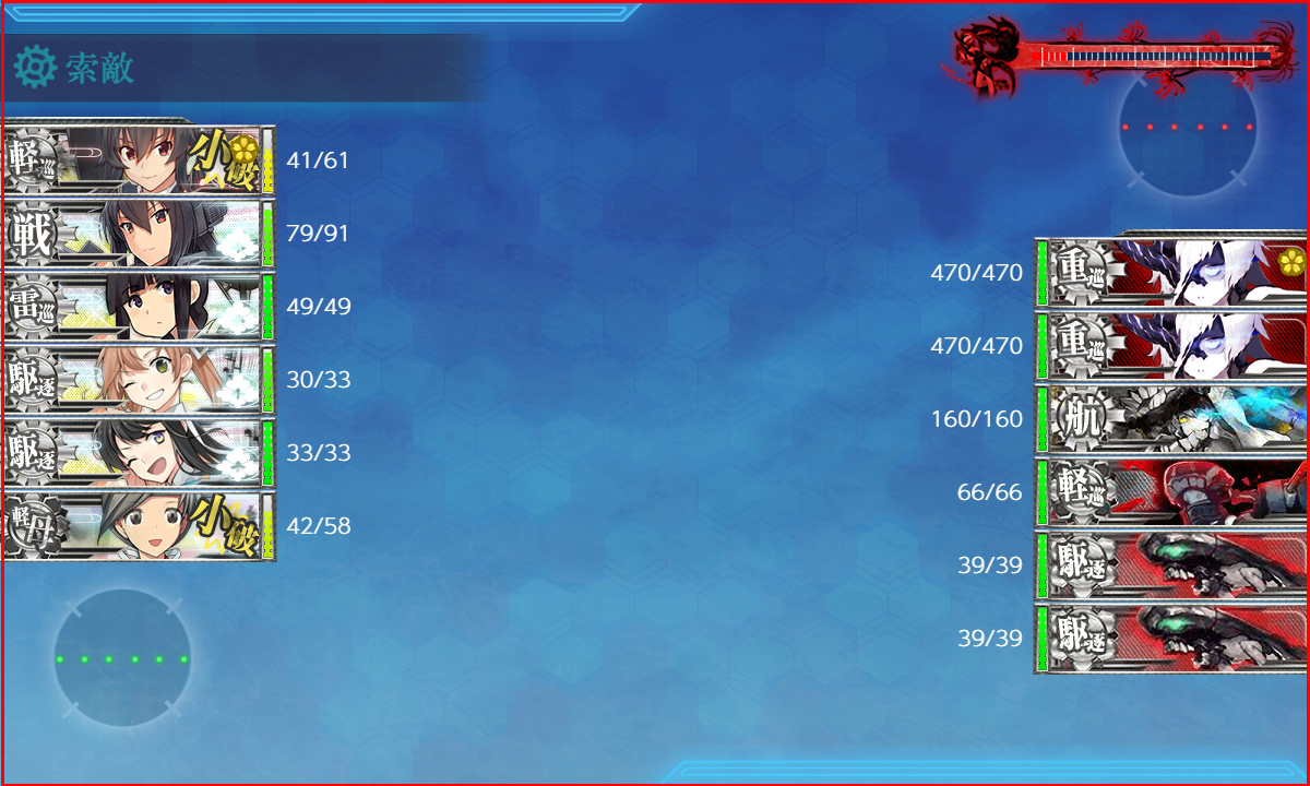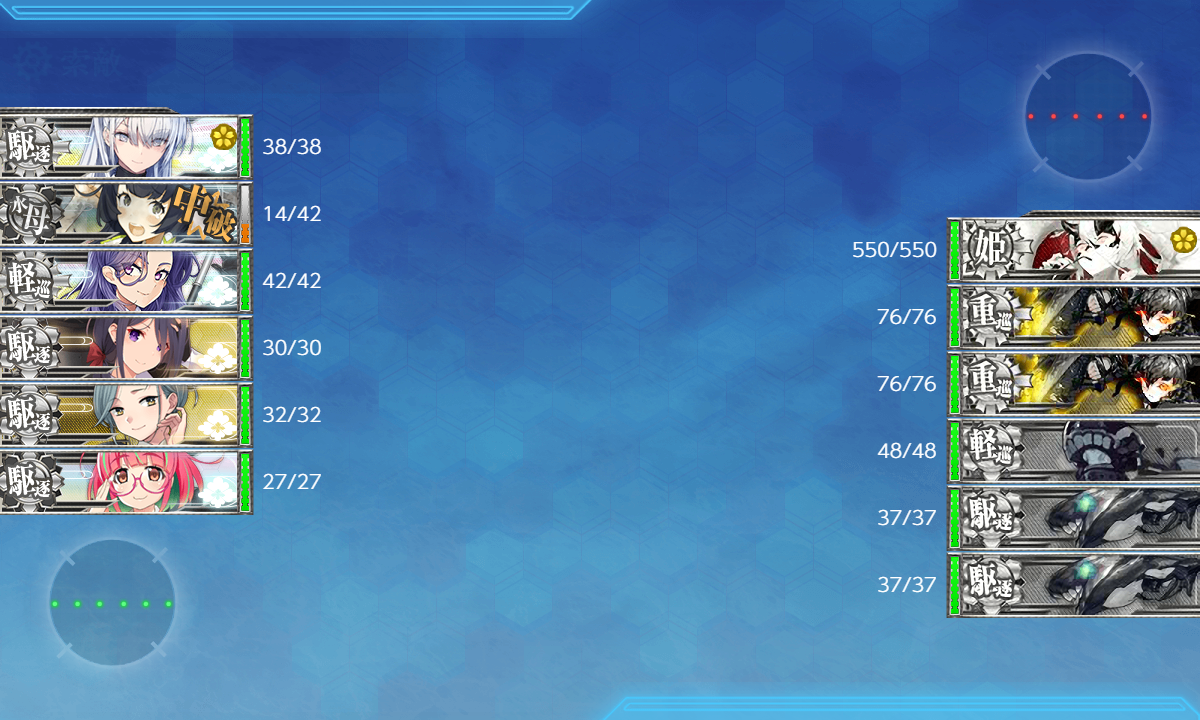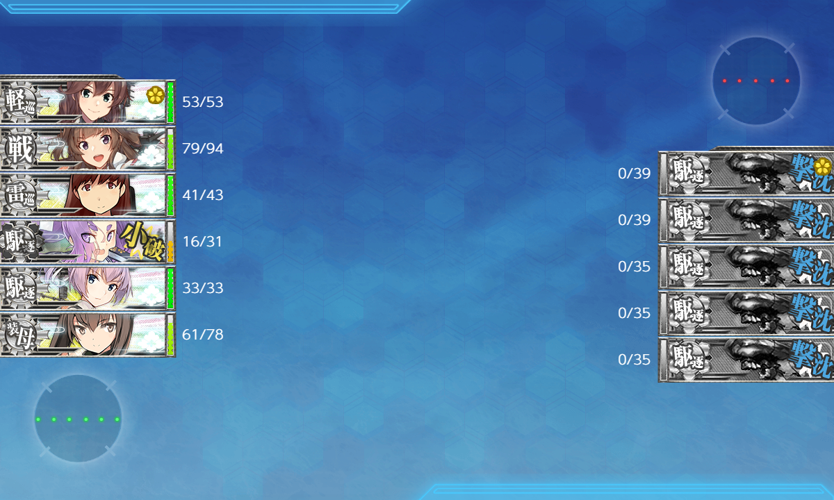2023年08月10日 【艦これ】 E-1 横須賀鎮守府/呉鎮守府【本土近海哨戒遭遇戦】 甲作戦 戦力ゲージ2 さて、いきなり最難関とか言われてるE-1-2です【ABCOQS】(A:空襲 C:潜水 O:通常 Q:通常 S:ボス)矢矧、長門はサブ艦。秋月は複数持ち艦です。いきなりの難関ということでメインの北上様投入。秋雲と千歳に増設穴開けました。道中は警戒陣で抜けるとして決戦支援入れます削りの間はこれでいいかなとボス編成微妙な支援削りはいけますねこのままラスダンまで削りましょううーん、次ラスダンかな??秋月out長波IN決戦支援もやまむさで下3つ確殺狙いますラスダン編成カーンカーンカーンほとんど大破中破してて無理だと思ったんだけど矢矧が3択スナイプして撃破!難関を無事突破できてよかった~撃破動画です