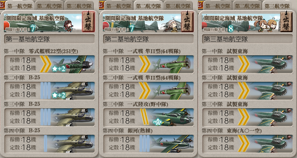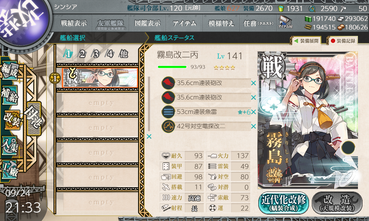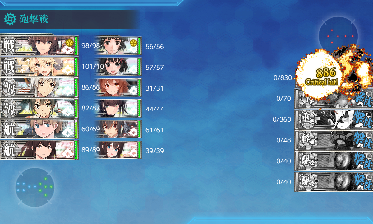 2024年09月14日 【艦これ】 E-5 ラバウル沖/珊瑚海方面【第二次珊瑚海海戦】 丙作戦 ボス出現ギミック さて、ボス出現ギミックです丙なので簡単っぽいXマス 通常 【MO機動部隊】 A勝利以上×2Yマス 通常 【MO機動部隊】 A勝利以上×2【MM1M2NOO1O2PWX】(M1:潜水 M2:空襲 O:通常 O1:空襲 P:空襲 X:通常(2回))【MM1M2NOO1O2PWZY】(M1:潜水 M2:空襲 O:通常 O1:空襲 P:空襲 Z:通常 Y:通常(2回))高速統一(大和採用時) 要索敵煙幕はZマス1部隊目:ギミックマスに集中2部隊目:ギミックマスに集中3部隊目:M1マスに集中XマスS勝利1回目XマスS勝利2回目次はYマスYマスS勝利1回目YマスS勝利2回目ボスマス出現しましたさぁ、いよいよラストゲージです