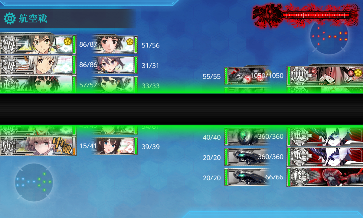 2024年09月14日 【艦これ】 E-5 ラバウル沖/珊瑚海方面【第二次珊瑚海海戦】 丙作戦 第五ゲージ さて、いよいよラストゲージですまずは削っていきましょう【MM1M2NOO2PWZZZ】(M1:潜水 M2:空襲 O:通常 P:空襲 Z:通常 ZZ:ボス)【MO機動部隊】※要索敵Atlantaはサブです煙幕はボス前のZマス1部隊目:ボスマスに集中2部隊目:ボスマスに集中3部隊目:M1マスに集中でっぱ~つボスボス編成スクショへたすぎ大和友軍支援なしでいけますね、これ…そんなこんなでラスダンラスダンだけ決戦支援いれましたラスダン編成ぼのが護衛退避で疲労ついてたので島風にチェンジ(丙なので札フリー)そして3度目で破砕なしで撃破!チガウキミジャナイPhoenix掘りは宿題になりました