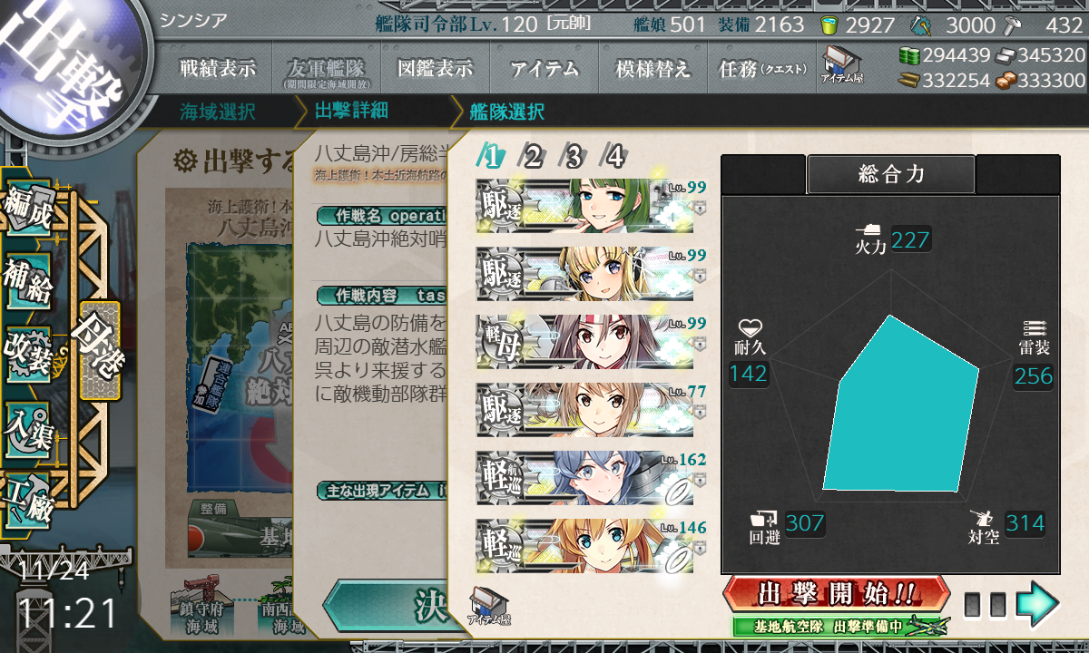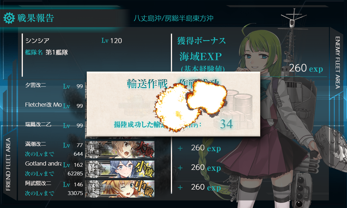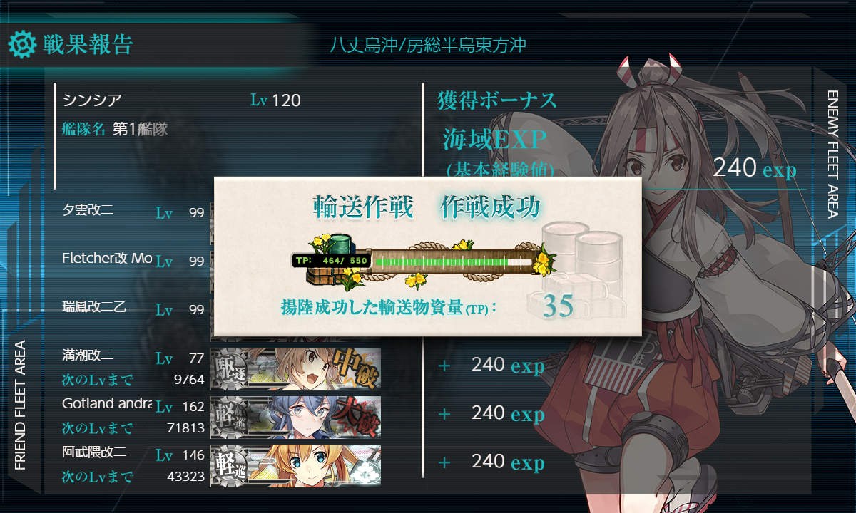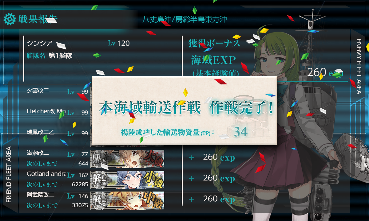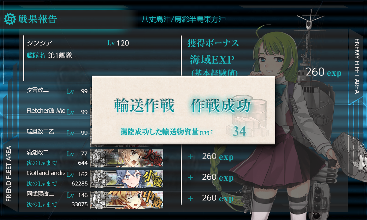 2021年11月24日 【艦これ】E-3 八丈島沖/房総半島東方沖 【八丈島沖絶対哨戒線】 甲作戦 輸送ゲージ さて、いよいよE-3です まずは輸送作戦 軽空1軽巡2駆逐3【ABCHI】(A:対潜 B:空襲 C:通常(潜1) I:ボス)【横須賀防備隊】 要高速統一。要索敵。 輸送量よりS勝利目指してみた編成 Intrepidでないかなぁ… 1部隊目:ボス集中 2部隊目:防空 3部隊目:AとC分散 でっぱ~つ S勝利でTPは51 ゆっくりやろう… A勝利でTP35 やはりゆっくりやるしかないか… 輸送終了 次は第二ゲージ(戦力) イントレさんはでなかったので また後で来ることになるのかな?
