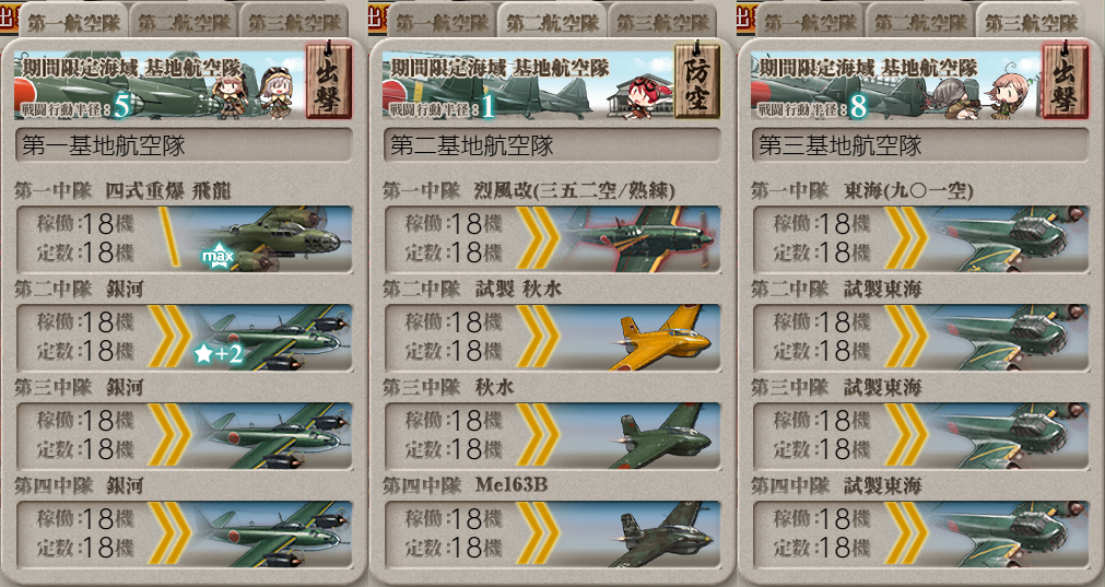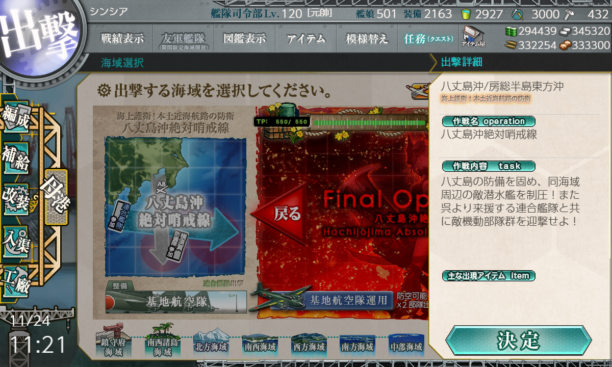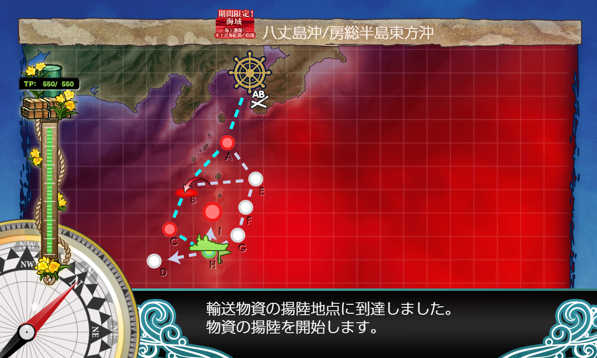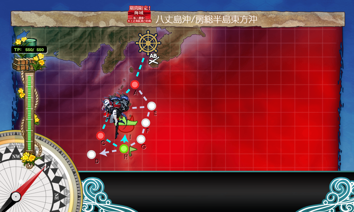 2021年11月24日 【艦これ】E-3 八丈島沖/房総半島東方沖 【八丈島沖絶対哨戒線】 甲作戦 ギミック(第3ボス出現) さてギミックです R2 S勝利×1 戦艦2空母2軽空1軽巡1【連合艦隊】 【JBELMNR1R2】 (B:空襲 E:空襲 M:空襲 N:通常 R1:対潜(ギミック) R2:連合(ギミック)) 1部隊目:R2マス集中 2部隊目:防空 3部隊目:R1マス集中 R2マス S勝利 ボスマス出現 いよいよE-3-3に突入です