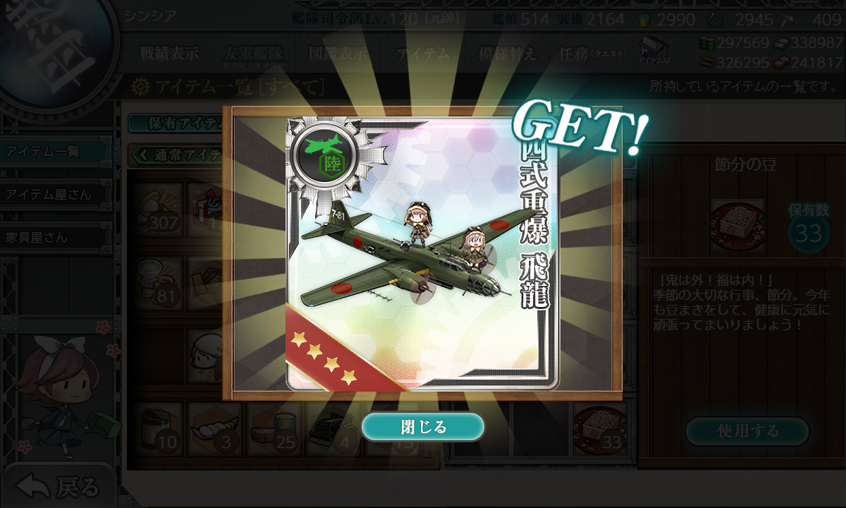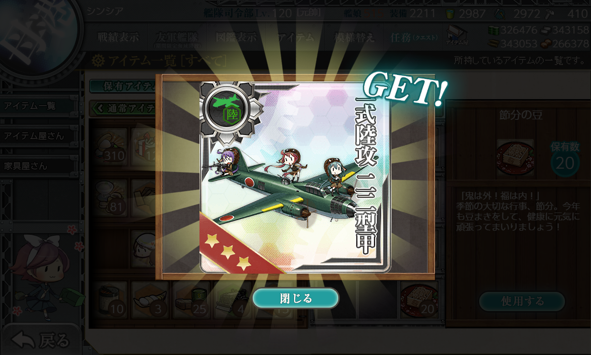 2022年02月22日 【艦これ】そうだ!豆をまこう! メンテに入ったので 今年の豆まきのまとめ 開発資材55持っていかれるんですよね 気を付けないと 飛龍1機目 飛龍2機目 一式陸攻二二型甲 これも開発資材28 最後はネジに変えておしまい 最終日デイリー演習で豆1つもらえたけど 取りこぼし時の予備ですね、これ というわけでメンテに 資材はだいぶ回復したけど ボーキをもう少し貯めたかった